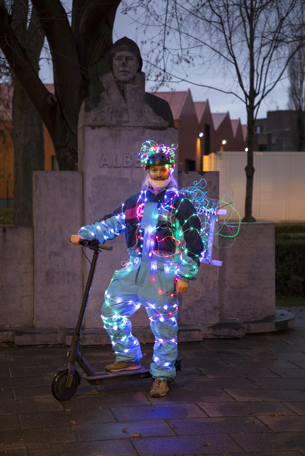 Across and for the 19 communes of Brussels, a flotilla of 5 riders on electric scooters wearing light-suits will illuminate our December nights.