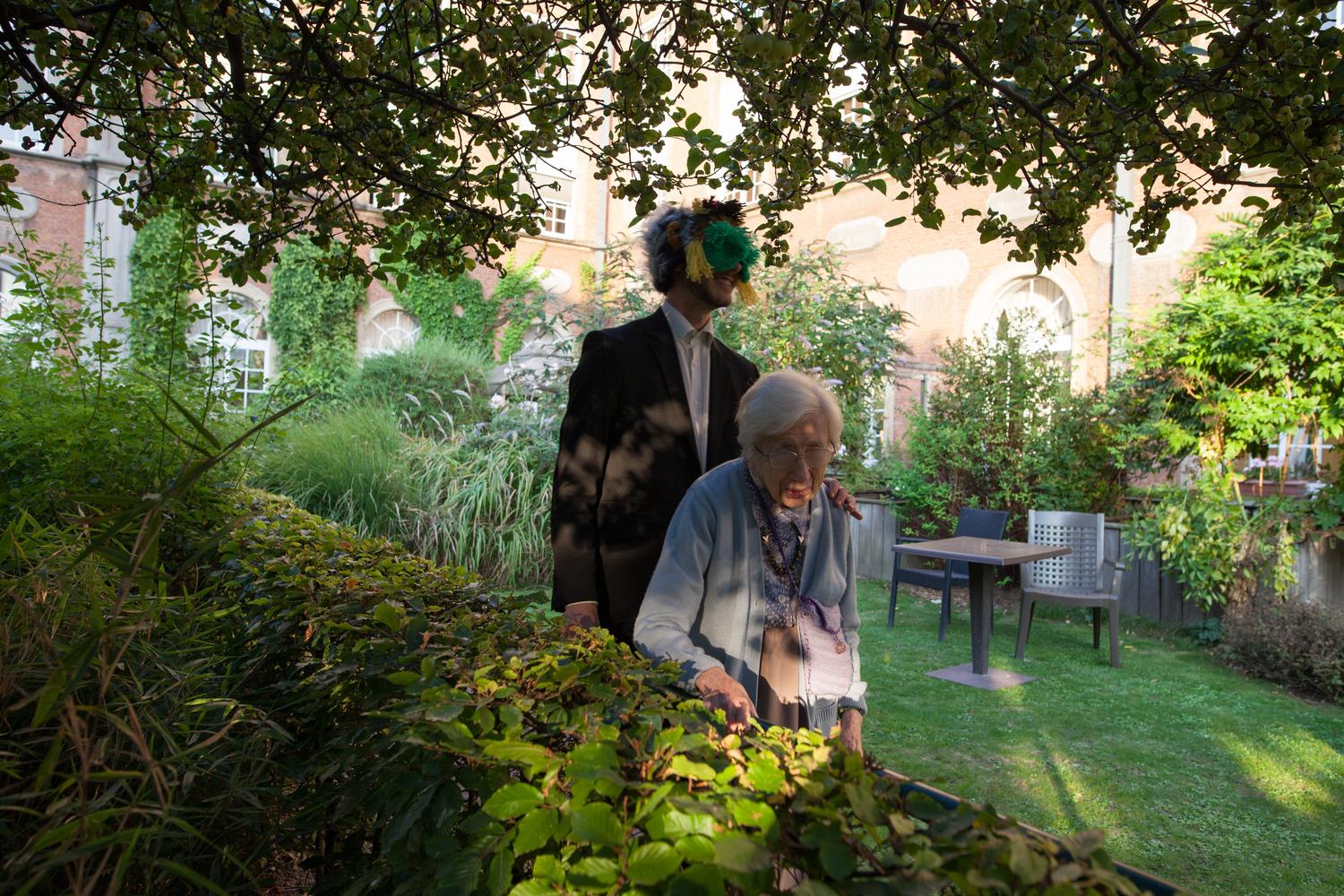 "Promenade à l’aveugle" était une expérience de cet ordre, créée le 9 septembre 2015, dans le cadre du festival d’interventions urbaines SIGNAL #4, organisé à Bruxelles par le Cifas. Ce jour-là, quatre-vingt personnes sont entrées successivement dans le jardin des senteurs de la Maison des Aveugles de Bruxelles. Aveuglées par un masque tricoté, ces personnes ont été guidées dans ce jardin par des pensionnaires de l’établissement, non voyants, mal voyants ou moins valides, parfois eux-mêmes guidés par des membres du personnel soignant. À l’issue de leur promenade, on ôtait leur masque aux promeneurs. Il leur était offert une tasse de thé, d’écrire s’ils le souhaitaient leurs impressions, et de voir le jardin dans lequel ils avaient été promenés à l’aveugle.