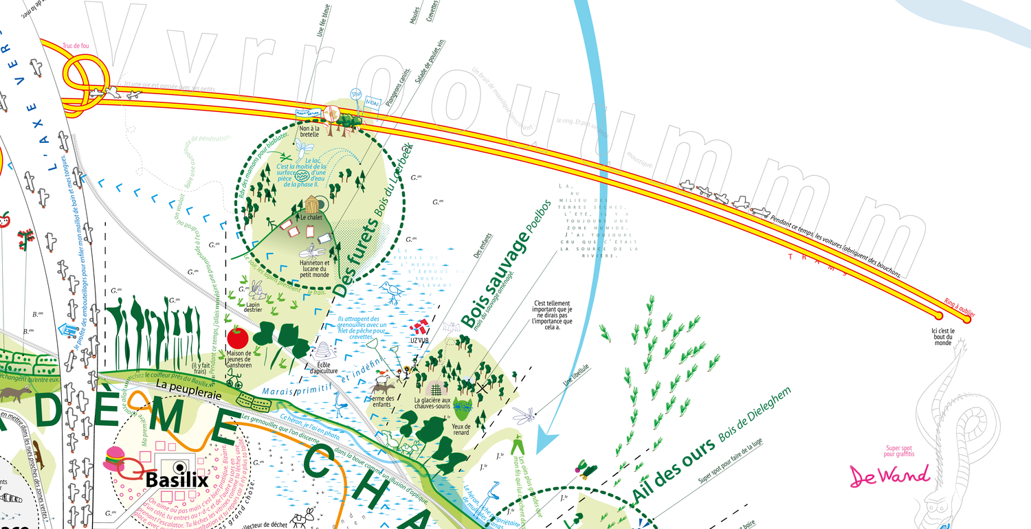 Catherine Jourdan et son équipe ont mené un atelier avec des habitants des quatre communes de Berchem Sainte-Agathe, Ganshoren, Jette, Koekelberg. Suite à cet atelier, elle a mis les visions et les idées du groupe sur une carte qui sera ensuite imprimée et affichée dans divers lieux de ces communes, notamment sur les panneaux publicitaires publics.