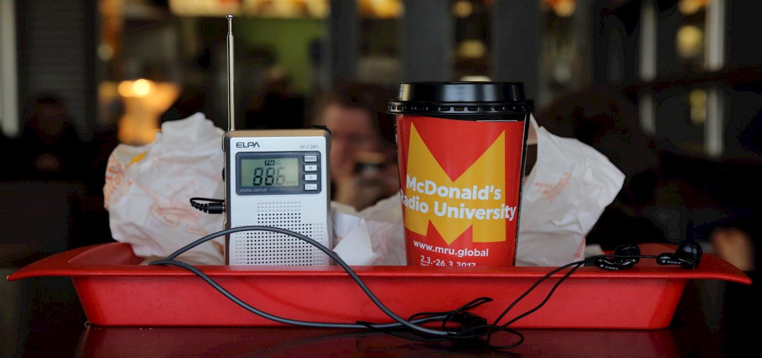 À partir d’entretiens avec des primo-arrivant·es qui empruntaient la route des Balkans pour gagner l’Europe, l’artiste Akira Takayama a été interpellé par le fait qu’en vertu de la gratuité du réseau wifi, la possibilité de recharger son téléphone et enfin la facilité d’accès aux toilettes, les restaurants McDonald’s étaient devenus des lieux de rencontre et de partage d’informations sur les voyages. Cela lui a inspiré la création de McDonald’s Radio University, un projet dans lequel Takayama réalise le dessein utopique d’une université mobile et décentralisée, telle qu’elle avait été jadis conçue par l’architecte britannique Cedric Price. Il reconvertit temporairement des succursales de McDonald’s en réseau d’amphithéâtres. Takayama utilise ces plans pour développer un modèle de transmission des connaissances et de formation continue pour des gens dont les savoirs ne sont pas reconnus par la société (primo arrivant·e·s, travailleur·euse·s précaires, personnes sans-abri). Pendant dix jours, des « professeur·e·s » exposent et explorent les standards du savoir académique traditionnel à la lumière de leurs expériences de vie et de leurs centres d’intérêts.